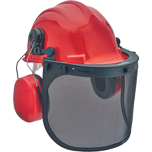 Bosbouwset bestaande uit een rood helm gemaakt van ABS met verstelbare hoofdband. Geschikt voor hoofdomvang 55-62cm. 4-punten bevestiging, PE binnenwerk. Bevestiging voor gelaatsscherm en rode gehoorkap, 26 SNR, EN 352-3:2002. Helm – EN 397:2012+A1:2012, ANSI Z89.1