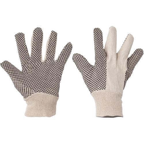 Handschoenen genaaid van katoenen canvas, met PVC stippen op de handpalm en vingers en elastische rand.