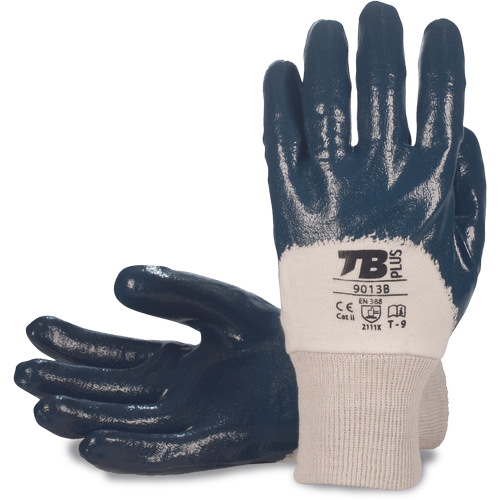 • gloves with cotton lining, 3/4 blue nitrile sauce, knitted cuff • good resistance to oils, lubricants and oily by-products • elastic cuff and lightweight glove base that absorbs moisture